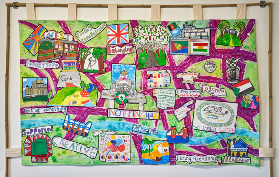 We added words to expand on the concept of belonging, flags representing group members, and cultural input to the city from the participants themselves. This was to demonstrate that they have an important place in and contribution to the cultural life of the city, rather than being passive recipients of its hospitality.